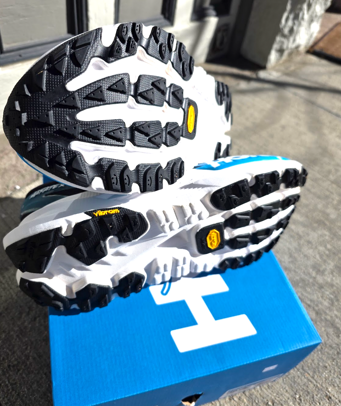Men's like new Hoka Mafate X in size 14, black skyward blue. These shoes were worn a few miles and returned. Will ship in the original box. Final Sale item.