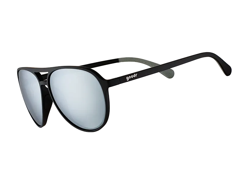 Semi-rimless, blue shield frames. Polarized gradient lenses reduce glare from the sun shining on your kidnapper's metallic exoskeleton. Won't slip or bounce while you desperately try to escape your cyborg captors. (P.S. Resistance is futile.)