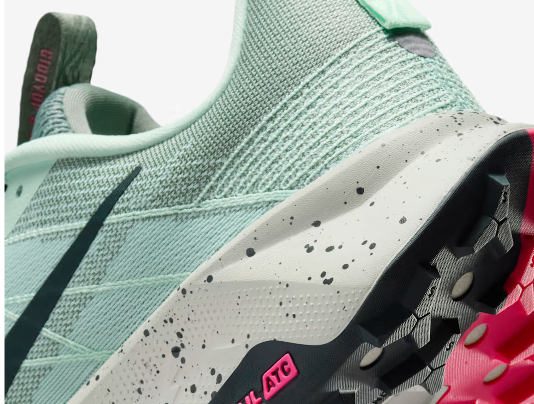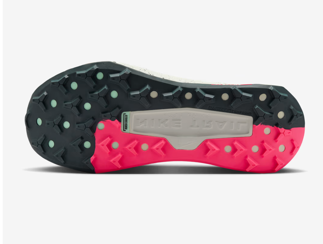 Underfoot, the shoe features Nike React foam in the midsole, offering a plush, responsive ride that absorbs impact without sacrificing ground feel. The segmented rock plate adds protection from sharp objects underfoot, making rocky trails more manageable. On the outsole, aggressive lugs made from high-abrasion rubber provide excellent grip and traction, especially on loose dirt, gravel, or mud.