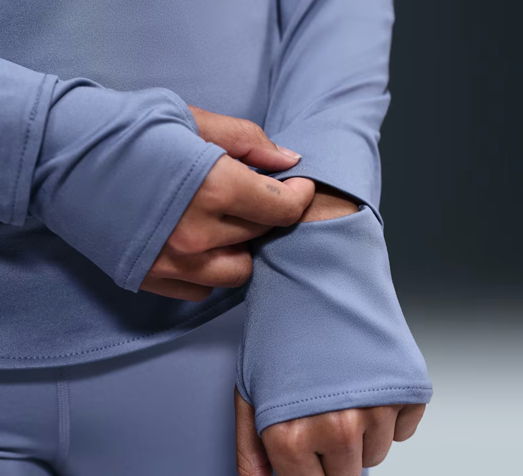 The top is tapered around the waist so that layering with other pieces is easier. A curved hem helps keep you covered through your stride. Plus, thumbholes let you extend your coverage and help hold the sleeves in place.